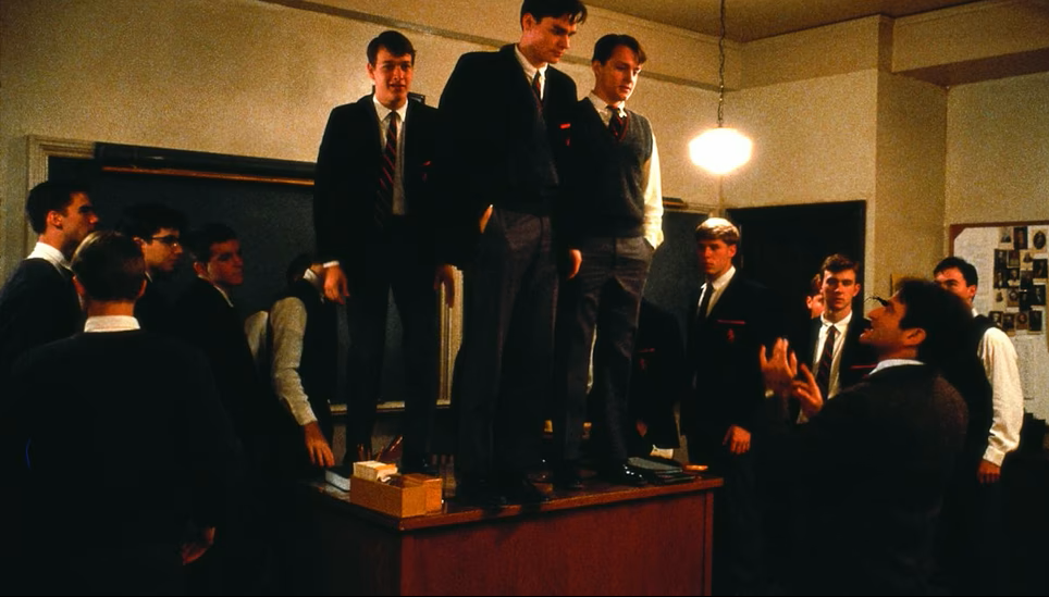 على الرغم من كل حديثه عن “إيجاد الطلاب لصوتهم الخاص”، فإن كيتنغ في الواقع لا يتيح لطلابه سوى فرصة ضئيلة جدًا للتفكير الأصيل. إنها حرية يُبشر بها كثيرًا ولكنها لا تتحقق أبدًا. يُقدم مثال صارخ في إحدى اللحظات الأيقونية للفيلم، عندما يقفز ذلك السيد كيتنغ المهرج بأساليب تدريسه “غير التقليدية” فجأة على مكتبه. لماذا؟ “أنا أقف على مكتبي لأذكر نفسي أنه يجب علينا باستمرار أن ننظر إلى الأشياء بطريقة مختلفة”، كما يصرح بلباقة. يا للجرأة: إنه يقف على ارتفاع قدمين ونصف تقريبًا عن الأرض. كان رالف والدو إيمرسون، في مقالته “الطبيعة”، قد طرح نفس النقطة بشكل أكثر جذرية، مقترحًا أن “اقلب عينيك رأسًا على عقب، بالنظر إلى المشهد من بين ساقيك”.
